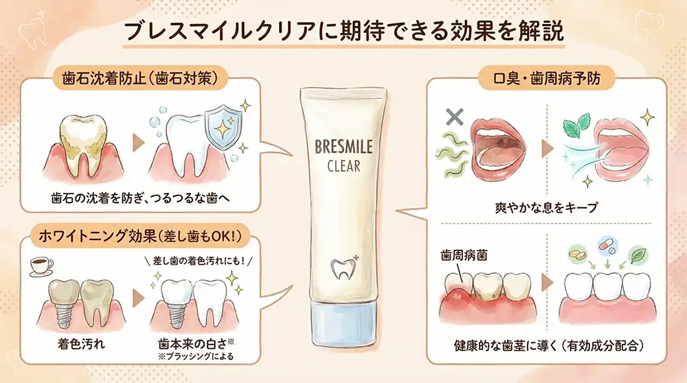 ブレスマイルクリアの効果効能として、歯周炎の予防、歯肉炎の予防、歯を白くする、歯石の沈着を防ぐ、虫歯の発生および進行の予防、口臭の防止、たばこのヤニ除去、口中を浄化する、口中を爽快にするなどが挙げられます。