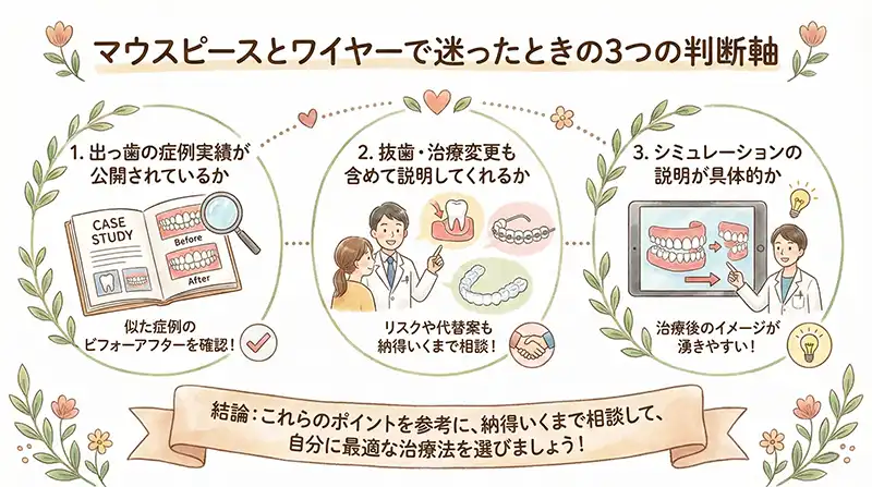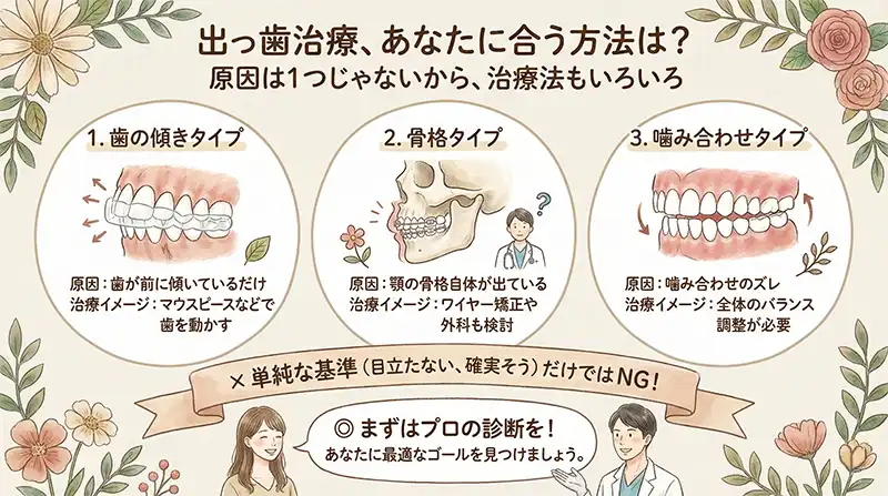 大切なのは、自分の出っ歯がどのタイプで、どこまでの改善を目指すのかを理解したうえで治療法を選ぶこと。