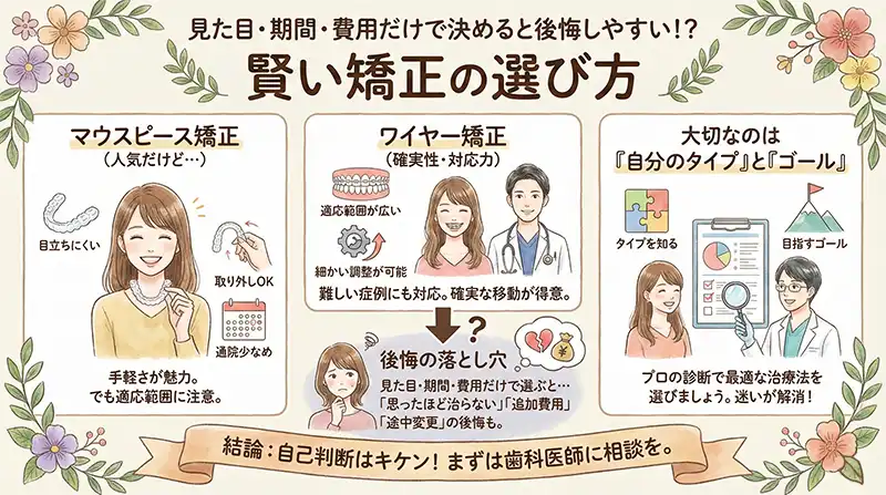 そのため、「目立たないからマウスピース」「確実そうだからワイヤー」といった単純な基準だけでは、正解にたどり着きにくいのが実情です。