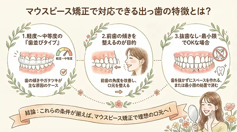 ここでは、マウスピース矯正で対応しやすい出っ歯の特徴を整理します。