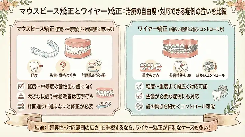 特に、重度の出っ歯・骨格性・抜歯が必要なケースでは、ワイヤー矯正の方がコントロールしやすい場合があります。