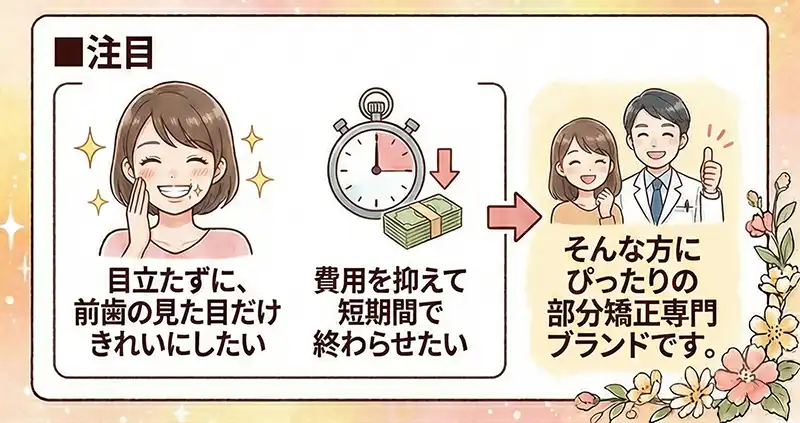 | 前歯の歯並びだけを整えたい 費用を抑えて短期間で終わらせたい 目立たず、仕事中も気にならない矯正をしたい 全国どこでも通える矯正ブランドを探している 部分矯正でも自然な仕上がりを重視したい | 噛み合わせを含めて全体を治したい 長期的なフォローや細かな調整を重視したい 奥歯のズレや顎関節の不調も同時に改善したい |