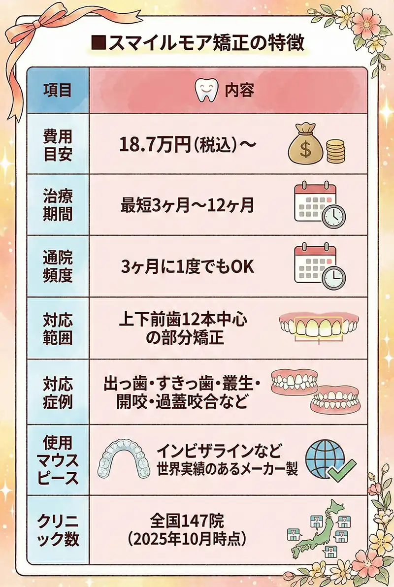 「スマイルモア矯正」は、前歯の歯並びを短期間・低価格で整えることに特化したマウスピース矯正ブランドです。