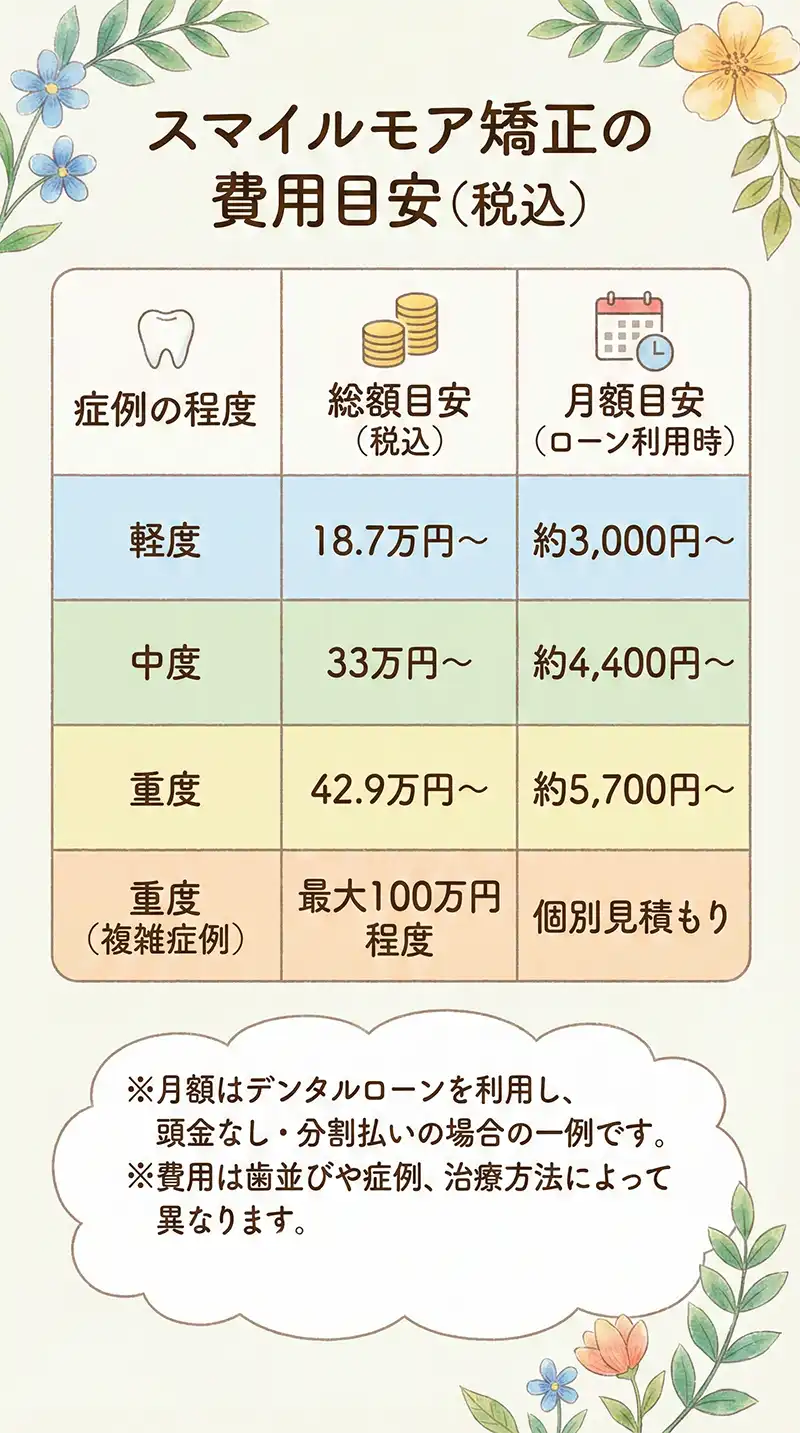 | スマイルモア矯正(軽度) | 約17万〜30万円 | 症例で決定 |