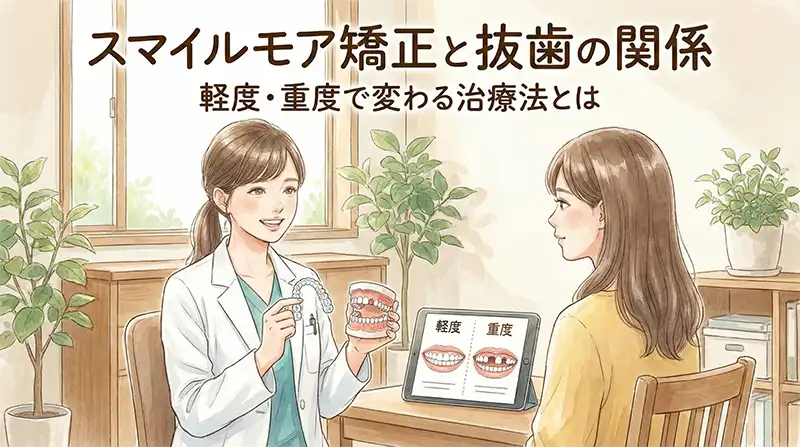 抜歯が必要になるかどうかは、見た目だけでは判断できません。費用にも影響するため、詳しくはスマイルモア矯正での抜歯の解説ページで整理しています。