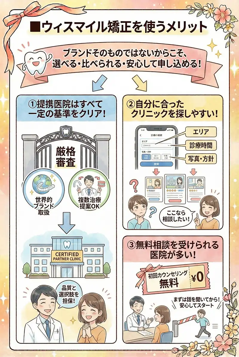 ウィスマイル矯正は、矯正ブランドそのものではないからこそ、選べる・比べられる・安心して申し込めるというメリットがあります。