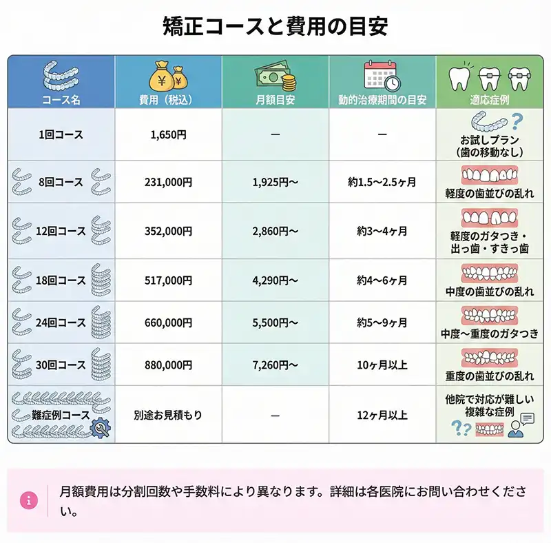 | 1回コース | 1,650円 | — | — | マウスピース矯正を試してみたい方へのお試しプラン。実際の歯の移動は行われません。 |