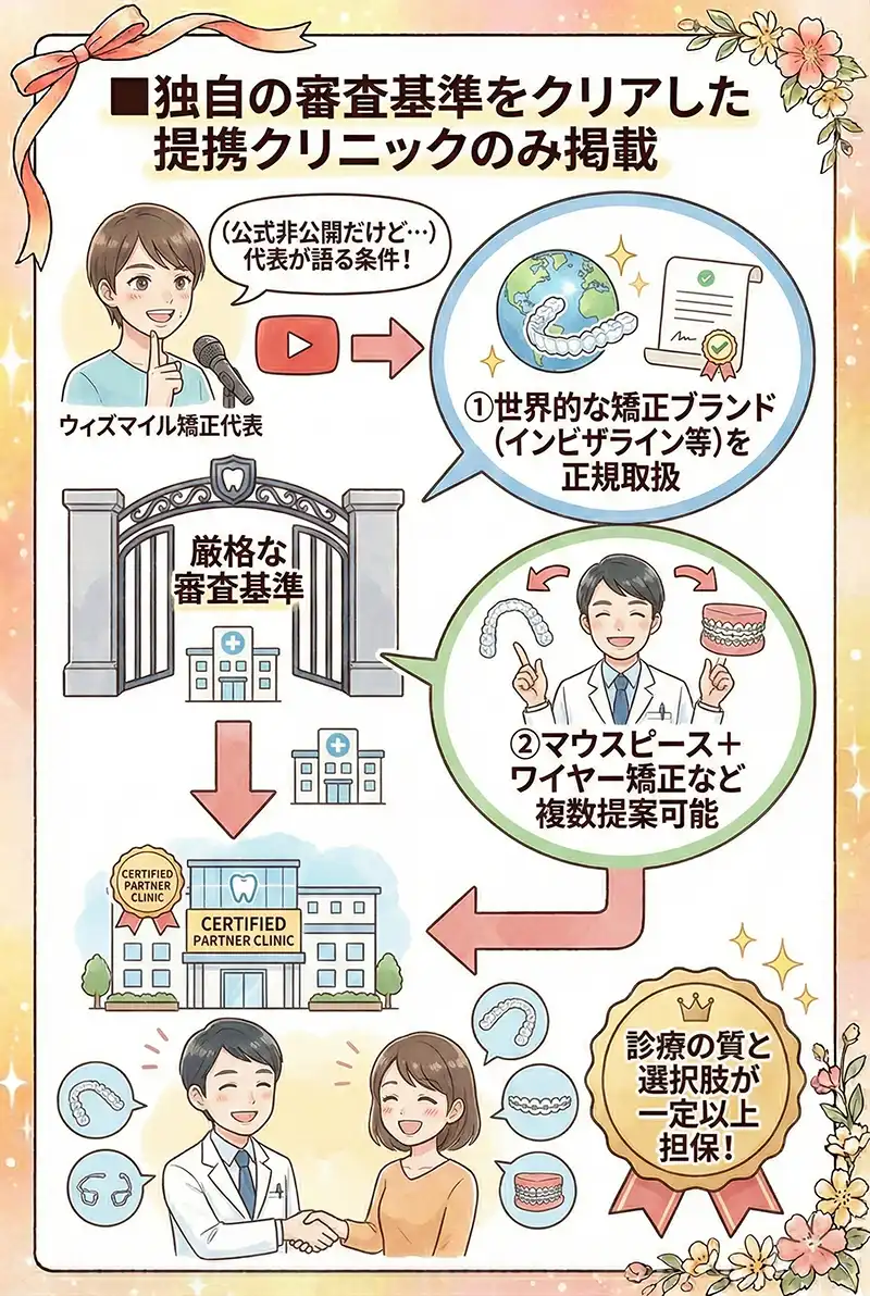掲載基準は公式には明示されていませんが、ウィスマイル矯正の代表がYouTube等で語った内容によると、